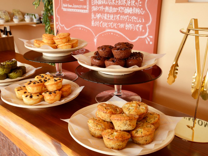 外はカリッと、中はもっちりとした食感が人気!豆乳をふわふわに泡立てた、しっとりキメ細やかな豆乳米粉シフォンケーキ、米粉クッキーや米粉麺も販売。